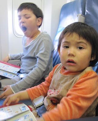 要出發旅行去囉!不過我們班機時間在傍晚,大哥已經頻頻打哈欠了。大哥研究飛機安全手冊,小妹當然也要和哥哥一樣,好好研究一番。