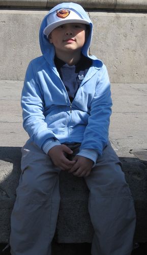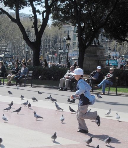 3/24/11 第二天,因為老公他娘沒特別想去哪裡,我們也還是沒計畫狀態,乾脆先到市中心Plaza Catalunya去晃晃,Luka和Leia追了一會兒鴿子,接著往觀光客聚集區La Rambla前進。〈有個方向感挺好的老公的好處,就是即使我偷懶沒研究地圖,也不怕一群人會在大街小巷中迷路,而且現在還多了個Luka幫忙研究地圖和記路,反而我老是會被自己兒子碎碎唸說我記錯路了!真是OO+XX......〉這裡的廣場大概比較少在清地板,因為滿廣場鴿子的結果,就是滿廣場的鳥糞,老公他娘拉著大家很快穿過廣場,因為鳥糞太多了。很奇怪,明明倫敦也是一堆鴿子啊,地板就沒這麼顯目的鳥大便,大概倫敦人比較勤快清地板。