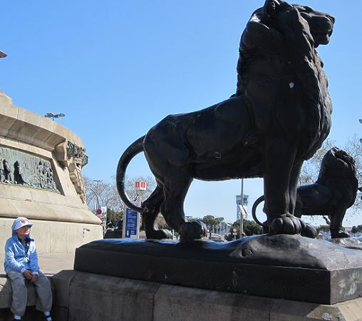 La Rambla走到底,有這個四週環繞著獅子的哥倫布銅像。再繼續走就走到靠地中海的港口。在靠海的shopping mall Maremagnum外的餐廳解決午餐〈當然是又貴又沒吃飽〉,再一路往回找其他路走,順便看到很多提著大包巾的人,裡面包著形形色色的「名牌」包和太陽眼鏡,警察來了就包起來跑給警察追,警察不見了就又放下來打開兜售。走著走著,不喝水的老公他娘口渴想喝咖啡,順便坐下來休息加尿尿。然後我就喝到一杯大概100 c.c要價3.5歐元的拿鐵!難怪走沒兩步路就是一家咖啡館,超市裡的咖啡豆明明就很便宜,咖啡館裡的咖啡卻這麼貴,利潤實在高啊!