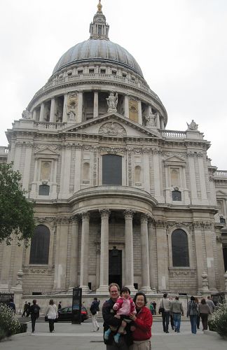 今天繼續London Pass行程,第一站決定先到St. Paul's Cathedral。倫敦其實一堆大教堂,光London Pass裡就包括很多〈可惜不包括西敏寺大教堂〉。不過旅遊手冊裡最推薦的是這一家St. Paul,我們也只想看一間教堂,所以就決定來這間看看。St. Paul的外觀跟西敏寺大教堂比起來,其實蠻不起眼,可是內部,尤其是天花板,還挺美的,〈是說我們沒去西敏寺裡面參觀,不知道裡面長得如何〉然後打敗拿破崙那個有名的Nelson將軍,就是長眠於此。裡面參觀完後,Luka想爬到頂樓去,本來想說老爸陪兒子去挑戰那幾百層階梯,我們老弱婦孺在樓下悠哉等就好,不過如意算盤沒打好,少算了喜歡跟大哥趴趴走的小姑娘!大哥興高采烈和爸爸跑去爬樓梯,小妹怎麼可能安靜和媽媽阿媽坐著翹腳聊天等人,當然不顧老媽叫停,一溜煙就跟著也爬上樓梯。阿媽也說乾脆慢慢爬上去好了。本來是擔心阿媽膝蓋比較無力,那麼多樓梯可能爬不上去,既然阿媽要慢慢走上去,我們就全都慢慢跟著上去了。我們一直走到最上面小小圓圓的Golden Gallery,總共528階樓梯,從最下面寬寬可走兩人的梯子,一路變窄上去,一直到最上面那部份只容一人通過挺陡的螺旋梯。小姑娘當然是還沒爬完257階到第一部分Whispering Gallery之前,就要媽媽抱了。唉,小姑娘雖然沒大哥大隻,也已經有12公斤,抱著爬樓梯很累耶!所以爸爸在Whispering Gallery發現我們全都跟上來,寶貝老婆還可憐兮兮地扛著寶貝女兒,二話不說接過女兒,跟著精力充沛的大哥又繼續往上爬,我們則先稍事休息,然後也慢慢繼續往上。