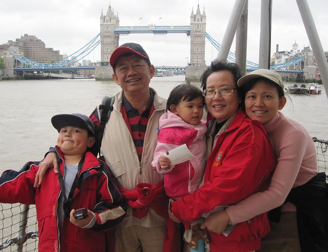 有名的地標橋Tower Bridge就在Tower of London旁邊,Tower Bridge下面的橋可以從中間分開往上,好讓比較高的大船過去。London Pass有包括裡面博物館的門票,所以我們從Tower of London出來後,當然是沿著River Thames走到Tower Bridge囉。這時飄起細雨,跟阿媽一起出門的好處,就是萬事準備齊全,點心飲水乳液面紙濕紙巾都有,連擦蚊蟲咬的軟膏都有,雨傘當然更不用說!到Tower Bridge裡看了這座橋興建的歷史和關於倫敦及泰晤士河沿岸的風光展覽,出來後天氣還是陰的,可是已經沒雨了,所以我們在這一帶晃了好一陣子,也照了很多不同角度的Tower Bridge當背景。因為沿岸景色不錯,古老現代綠地河流都有,而且都五點了,反正也無法再去別的景點了。