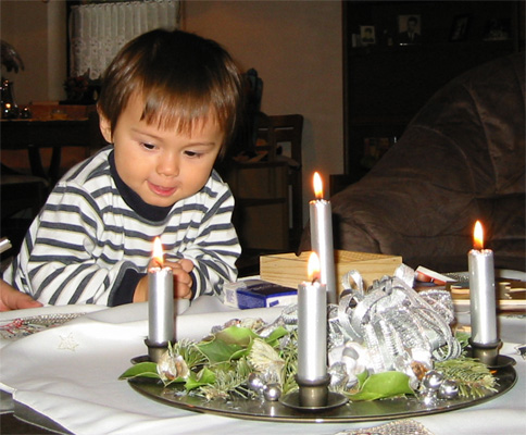 12/25 - Luka看著大人吹蠟燭,也要來湊熱鬧,不過Luka吹出來的可不是風,而是一堆口水!他正試著從各個角度把蠟燭"吹"熄呢!