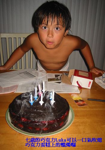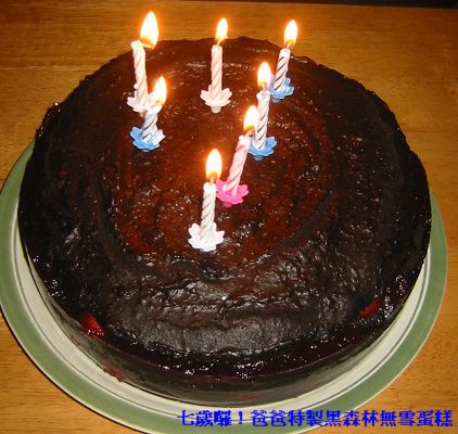7/25/09 - Luka七歲囉!今年很興奮地跟我們家的點心師傅訂了沒有雪的黑森林蛋糕 ( http://www.schimo.com/feng/Feng'sArticle072409.html )