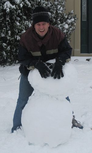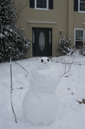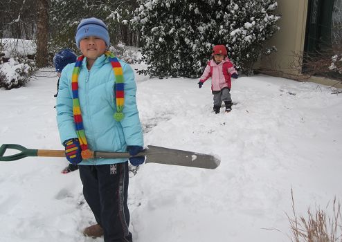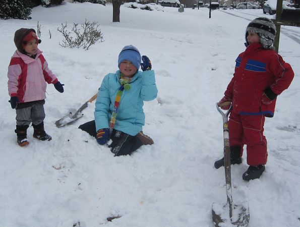 不過第二天睡醒就一點都不浪漫了。雪因為被冰晶壓緊實,已經不是鬆鬆的雪花,比較像小片小片較鬆的冰,這種路況不管開車走路都很危險,車子容易打滑行人容易滑倒,而且厚厚白雪蓋著馬路,駕駛根本看不到路上標線或分隔島或路旁人行道在哪裡。然後大概是南邊每年下雪天數十根手指還用不完,每次下雪還很快就融化了,所以不管政府民間都沒清馬路冰雪的工具機器,於是以不變應萬變,大家就停班停課一天吧。最高興的大概就是小朋友們了。早上十點多我們才剛吃完早餐,已經有人來敲門問Luka可不可以出去玩了!打開門一看,門前的小徑完全看不到,積雪大概十公分深。大哥很興奮,拿著鏟子想鏟出一條通道,不過不怎麼成功。小妹看哥哥這麼興奮,也高興地哇哇叫著要衝出門玩,被媽媽勉強抓著著裝完畢,終於出門走兩步路腳都陷在雪裡拔半天之後,轉成唉唉叫著「Leia沒辦法走路,媽媽抱抱!」還不肯回屋子去呢!沒多久之後,很久沒玩雪的老爸也跑出來,跟小朋友們打一會兒雪球仗之後,開始蓋起雪人。