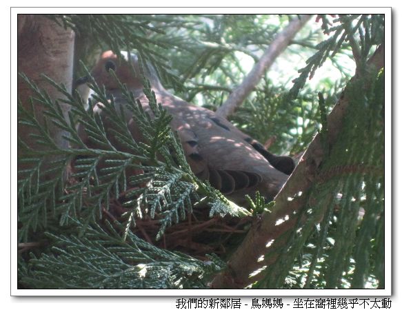 大概一星期前吧,我們發現有兩隻鳥經常在主臥房浴室窗戶外的大樹上留連徘徊,經過後來幾天較詳細的觀察,發現有一隻(我猜是公鳥)經常嘴巴著稻草回來給留守那隻(我猜是母鳥),幾天後母鳥留守處的樹枝上,一個鳥窩慢慢成型,接著這隻母鳥就坐進窩裡,然後就一直坐著,從來沒見她起來過,於是我猜她坐的地方下應該有幾顆蛋,不過因為母鳥老是坐著,我們看不到底下是不是真的有蛋。於是這兩天早上起床刷牙,和白天蹲廁所時,我們都會注意一下新鄰居的動靜,尤其 Leia都會一邊不停「啾啾」叫,一邊指著母鳥,要我們抱她站到高高的浴缸邊上看窗外的鳥媽媽;Luka則總是白目地故意製造一堆噪音。然後自從窩做好後,公鳥就再也不見蹤影,不知道是找食物去,還是已經完成使命,跑了?!不過我覺得鳥媽媽真是太厲害了,真的幾乎沒在動,而且我很疑惑她要吃甚麼啊?因為不管何時看她,她就是一直坐著,連站起來都沒,更別說離開了,難道鳥爸爸其實有常常送食物來,只是我們沒看到?到目前為止,鳥媽媽已經這樣坐著不動過了大概五天。我們好期待看到幾隻鳥寶寶終於探頭出來的一天,不知道這隻鳥媽媽孵蛋孵多久啊?!
