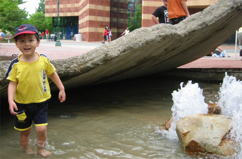 我們待的旅館就在Chattanooga市中心,旁邊就是children museum,走路五分鐘遠處有田納西水族館,水族館後面是田納西河,從水族館前、兩旁、到田納西河前,有幾乎是連續的人工水道相通,Luka以前看到噴水池都只站遠遠看別的小朋友玩,這次竟然也下水了,而且還從一開始穿鞋子玩,到後來鞋子脫掉直接下水,還一路走水道到河邊去!終於讓媽媽覺得Luka好像比較不龜毛了。在水族館後有個大概三層樓高的階梯,一邊讓行人走,一邊卻有水一路往下流,到最底下是一個類似小游泳池的地方〈我竟然沒有照片!不過這裡有:http://www.tnaqua.org/VisitorInfo/Images/Riverfront_flyer.pdf〉,好多小朋友在水裡玩,可能因為這樣,所以我們可以聞到重重的氯氣味,像游泳池的味道。Luka也要往水裡衝,結果Luka爹竟然跟Luka說在這裡下水不好,因為水裡有加氯氣,等一下起來沒有馬上洗腳,腳會很癢...天啊,Luka娘第一次聽到這種說法,而且,終於知道Luka為什麼會這麼龜毛、有一堆怪怪的原則了!好不容易Luka終於像其他小朋友一樣愛玩水,他爹竟然還要管等一下腳會癢!結果Luka聽了他爹的話後,問了一句:「媽媽,為什麼有好多小朋友在水裡玩,腳都不會癢呢?」問得好!因為他們的爹不龜毛啊!!所以媽媽還是讓Luka下水去玩,不過五秒鐘後,Luka就跟媽媽說他的腳好像癢癢的,要起來了...唉...後來我們繼續往河邊走,還走到一個連接河兩岸、行人腳踏車專用的橋,對岸是一個挺大的河邊公園,那天天氣很棒,氣溫大概只有攝氏22,23度,大部分時候都陰陰的,很適合散步的天氣。我們就一路玩玩走走到橋那一邊,然後又走回這一邊覓食去。