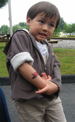 這個Thomas後面拖著的,就是等一下我們要坐的車廂。由於我們的班次時間還沒到,所以到處帳棚走走玩玩。Luka和很多小朋友一樣,手上多了個James的暫時刺青,有些爸爸可能小時候也是Thomas迷,臉上或手上也可以看見不同火車的刺青。