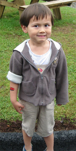 那邊還有一個圍起來的小地方,裡面放了很多稻草,和一些山羊、一隻驢子、一隻乳牛、一些雞,讓小朋友可以帶飼料進去餵動物吃〈飼料當然要付錢,而且大概太多小朋友餵了,他們都不餓吧?所以都不太想吃,可是有些小朋友會硬塞進牠們嘴裡,要牠們吃,那些動物們真可憐〉Luka遲疑了一分鐘,終於決定也要進去看動物們,還把媽媽也拉進去,結果Luka只是走一圈看看,根本沒有要摸摸山羊們,一圈後Luka說話了:「媽媽我們出去好了,這裡面的味道怪怪的。」媽媽深有同感:「對啊,我也覺得這裡面實在不太好聞,走吧!」好吧,這母子倆果然不適合鄉村生活!我猜Luka爹應該也是典型的都市小孩,所以他根本就沒進去!