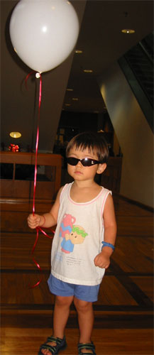 「媽媽,氣球換你拿,我要喝水」媽媽是從Luka把綁氣球的手伸過來,然後又要媽媽拿在手上的水,猜到Luka的意思。愈綁愈高的氣球是爸爸的主意,這樣Luka不見了我們可以很容易找到他!