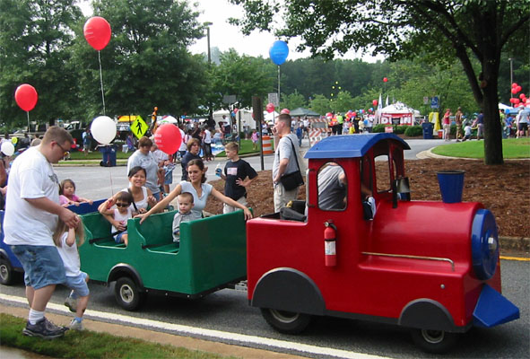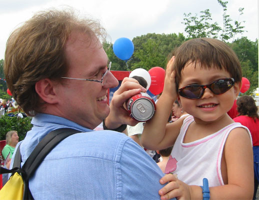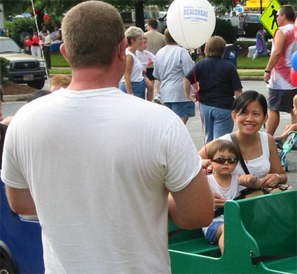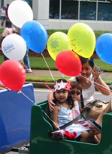 這個週末是美國獨立紀念日長週末,雖然我們不是美國人,不過難得有多一天的假期,也是一件值得慶祝的事!所以星期天下午一陣大雨過後,我們就出發到住家的郡法院中心,參加那兒的一個園遊會了。到那兒後我們才發現這個園遊會其實主要是許多要參加今年選舉的候選人贊助的活動〈今年美國不只要選總統,好像一大堆聯邦政府和州政府的官員或議員都要選,反正一堆廣告看版,可是很多不一樣的參選title,我實在搞不清楚他們到底要選什麼,或這個title到底是在做什麼的?!〉,所以裡面破天荒一堆免費的活動,譬如免費的臉臉彩繪、刺青、horse riding、遊樂器材、甚至免費的水、扇子、可口可樂!這些在一般園遊會可能都要所費不貲的東西,全部都免費!可惜Luka年紀太小,幾乎所有活動都跟他無緣,譬如彩繪和刺青,他是不可能安靜地坐在那兒任人擺佈;滑下來後是一攤小水池的高高的充氣溜滑梯,,媽媽個人是覺得那個對Luka來說太高了,問Luka要不要去滑也是搖頭,雖然Luka站在一旁看了好久都不肯離開;本來應該是可以騎騎迷你馬的,可是Luka的爸看到一匹匹的馬被套在鐵竿子上繞圈圈走,他覺得是在虐待動物,他不想讓Luka去做那個虐待馬馬的人,剛好我們在旁邊看時有一匹馬正在抓狂,於是就作罷。不過我們還是挺盡興地玩了一圈!愈晚人愈多,後來我們打消了要留到九點半看煙火的念頭,祭我們的五臟廟去了。