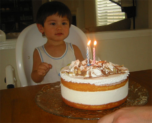 爸爸媽媽還買了一個冰淇淋蛋糕,名義上是讓Luka吹蠟燭過過癮,實際上是慶祝Luka的爹娘走過了這甜蜜居多、痛苦也不少的兩年!爸爸媽媽繼續加油!!順帶一提,Luka真的是不愛吃甜食的小朋友,一開始媽媽問Luka要不要吃一點點蛋糕,搖頭,媽媽不死心,硬是在Luka嘴唇上抹了一些冰淇淋,想說他嚐到甜甜冰冰的味道,也許會改變心意,不過Luka還是拒絕!雖然跟媽媽聽到的小朋友愛吃甜食、零食不太一樣,不過至少Luka會變成小胖子的機率不會太高,也算是好事吧!