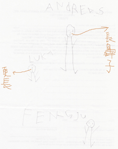放學回家後,雖然Luka一直說學校不好玩,他不想去了,不過還是跟媽媽說他在學校有用彩色筆畫圖,他有跟老師說爸爸有長鼻子。(不知道有沒有跟老師說為什麼?因為我們跟Luka說說謊鼻子會變長,所以不可以說謊。Luka馬上恍然大悟:「喔,所以爸爸小時候很愛說謊,現在鼻子才會長長的;媽媽沒有說謊,所以鼻子小小!」Luka爹聽了只能很無奈地笑笑。可憐的黑臉愛說謊爸爸!)不過Luka說:「可是我沒辦法把長長的鼻子畫出來,所以只好往下畫。」媽媽要Luka把他在學校畫的爸爸和媽媽再畫一次給媽媽看,Luka就一邊畫一邊解釋:「你看,這是爸爸的名字,所以這一個是爸爸。爸爸比較高,要畫大一點,這個是爸爸的長鼻子;(媽媽偷偷想著:「還真像流鼻血啊!」)媽媽你比較矮,所以我要畫矮一點,鼻子只有小小的...」媽媽:「那你沒有幫媽媽畫長長的頭髮?你看,我的頭髮長長的。」「不行,頭髮在後面看不到,沒辦法畫的!」呃...至少立體的概念還挺清楚啦。「這個是Luka,又更矮,因為我常常說謊,所以鼻子也都長長的!」哇,比爸爸的還長!真是誠實的小孩?!