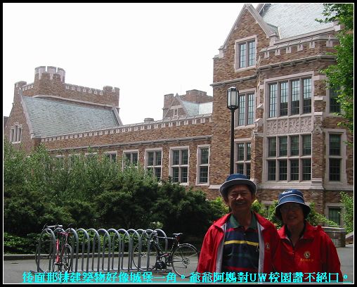 6/27/2007 - 在西雅圖第 四天。由於回台灣的班機是第二天凌晨兩點,旅館則是今天中午以前要checkout。要怎麼提著四大箱行李混到晚上十點再到機場去?於是我們決定租一輛箱型車minivan。既然有車,我們就可以到市區週邊看看;也因為有車,考慮到市區容易塞車、單行道一堆容易迷路、停車問題等,所以我們決定往西雅圖郊區跑。首先是到很多人稱讚校園很美的U of Washington。因為整個華盛頓大學校區很大,一天應該是走不完,我們只有去遊客較多的South central campus。問了幾個那兒的學生之後,都說要去那裡的大噴泉逛,很漂亮。可是我們去的時候,大噴泉在整修!所以我們只有看到很多的尖尖小小、圓圓大大這些工地用的工具、很大一片空空的噴泉空地、和圍了一圈的欄杆。嗚嗚,真哀怨......不過Luka工人ㄅㄟˇㄅㄟˊ很高興看到他的好朋友尖尖小小圓圓大大們!不過雖然沒看到大噴泉,還是覺得可以當這個已經一百多年的老大學的學生,應該很棒,走在校園裡感覺很乾淨舒服安靜,而且很學術,就是你不會誤會這是什麼遊覽勝地或是辦公大樓,這裡就是做研究的地方。而且即使是比較舊的建築,也都不會斑駁或是破舊,真的是個漂亮的校園。