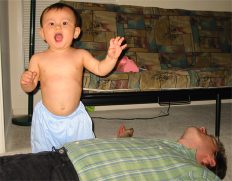 6/14/03 - 爸爸不准起來! 哈哈!爸爸倒地投降,Luka贏了!