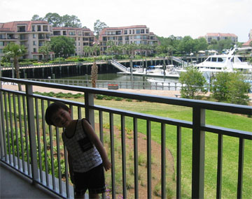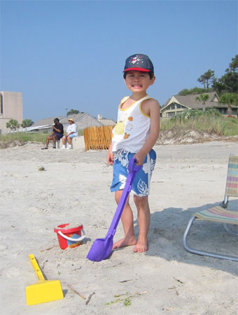 5/27/06 - Luka爹的同事在南卡州的Hilton Head Island買了一間三房三全套衛浴兩廳度假公寓,還放出消息只要他們沒計畫去那兒度假,親朋好友都可以預約,所以星期一爸爸就問了一些那兒的資訊,以及我們是否可以預約這個Memorial長週末,不過因為都是那個同事從事不動產生意的老公在負責,所以她說要先問問。星期四下午爸爸說對方答覆沒問題,一晚「只」收一百美金〈果然是現實的美國人,親兄弟明算帳,更何況只是同事!而且還不便宜啊!不知道如果是兩個家庭一起去,價碼會不會提高?〉,星期五爸爸去辦公室跟他同事拿那兒的鑰匙,於是這個海灘假期確定成行〈我們的度假計畫決策時間好像愈來愈短了〉!本來計畫一大早六點就要起床,七點出發好避開路上的車潮,可是前一晚玩電動玩到深夜一點多,睡覺前又忙著收拾Luka破壞的枕頭和挖Luka起來聽訓,所以一覺醒來已是八點多,媽媽和Luka早餐只好帶到車上解決,九點準時出發。下午兩點多到Hilton Head Island,走進公寓裡前前後後繞一圈....嗯,一百塊實在不算貴....三間房間共連著三間大浴室,內有大大的淋浴間〈還有可以坐下來休息的空間,淋浴真的有這麼累啊?〉,和大大的按摩浴缸〈可一同容納我們三個人〉,每間房間都有陽臺,且都面對藍天海景。客廳、飯廳相連,有兩個大大的海景陽台,一邊陽台還四周圍了紗網,不用怕夏天的蚊蟲。除了廚房比我們家的小,其他廳房都比我們家大!〈後來翻了公寓內關於Hilton Head的不動產雜誌,發現大部分的公寓都是六十萬美金起跳,獨棟附船屋和小碼頭的房子,則當然是百萬美金起跳,更不用說自有的遊艇了....這兒似乎是有錢人的天堂!所以說,一百塊真的是不貴....
