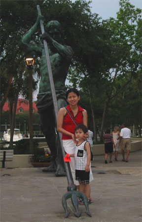暴風雨過後,我們終於可以出去認識環境,順便覓食。左邊照片是這個社區入口的一個天神雕像,他那個武器其實是個日晷,而且很準呢!Luka在一家店裡看到他的最愛 - 手上拿的尖尖小小〈Luka找尖尖小小的功力實在很強,遠遠從店外面就看到了,我們當然就只好進店裡去給Luka看個夠〉,馬上很想買的樣子。Luka爹:「OK, Luka's birthday gift then.」Luka馬上接口:「媽媽我要那個尖尖小小當生日禮物好不好?」媽媽:「可是你自己跟我說你以後生日和聖誕節都不要禮物了啊,這樣你就也不用送我們禮物啊!怎麼現在又要生日禮物啊?」〈這是小氣的Luka為了避免花錢買禮物送爸爸和媽媽,自己親口跟媽媽說的,有夠小氣吧?!〉Luka有點兒靦腆地笑笑,毫不遲疑馬上說:「以後爸爸和媽媽生日我都會送你們禮物了!」媽媽繼續捉弄Luka:「真的?那錢錢花光了怎麼辦?你不是不喜歡沒有錢錢?」Luka馬上回答:「沒關係,Amy阿姨過年會給我紅包,我就又有錢錢了!」怎麼之前都不這麼想啊?!只有要禮物時才會變慷慨!不過Luka終於擁有一個不是媽媽做的尖尖小小。後來回去泡按摩浴缸時,Luka的尖尖小小也一起泡澡。