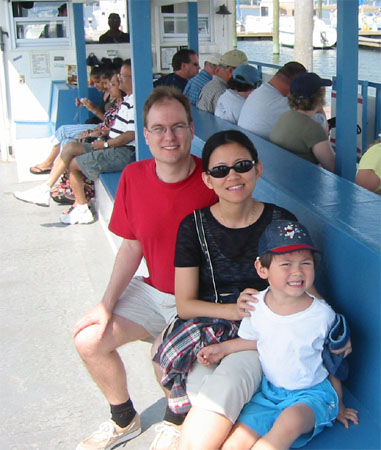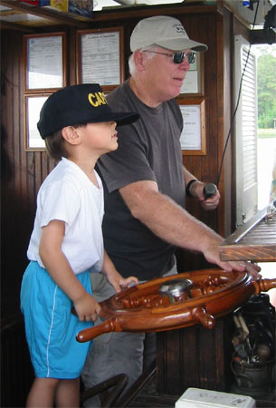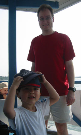 5/29/06 - 來到這兒沒有自用遊艇可開出海,那當然要坐船去看看海豚囉!所以這天早上的行程是Dolphin watch cruise。總共兩小時,對Luka來說久了點兒,要他一直乖乖坐著找茫茫大海裡的一兩隻海豚,實在很不可能,不過後來船長讓小朋友輪流去幫他開船,Luka很興奮,第一次開船喔!Luka娘可一次都沒開過呢!