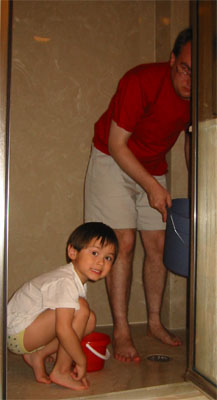 從沙灘回到豪華公寓,我們又跳到社區裡的游泳池玩水,因為Luka根本沒玩到水,還好他現在不排斥在游泳池玩水,還玩得不肯走了。後來快中午了,太陽開始很毒,我們又不像很多白人,喜歡曬出健康的膚色,所以媽媽就帶Luka回公寓的按摩浴缸,繼續玩水。等爸爸煮好義大利麵加肉球(meatball),我們愜意地在陽台一邊欣賞海景,一邊解決簡單美味的午餐。〈後來要回家時,Luka:「ㄏㄚˊ....要走了喔?我不想回家,這裡有肉球可以吃!」除了額頭上冒出三條線,媽媽實在無言以對....那個肉球我們家冰箱也有啦!〉
