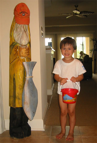 這個漁夫就站在大門口一進去。Luka覺得他是壞人,因為他抓了一隻魚。而且豐富的想像力讓他覺得這個壞漁夫會跟在他後面追他,所以Luka很怕這個漁夫。Luka爹不知去哪兒找來這頂帽子,把漁夫眼睛蓋住,然後說他看不見了就不會追Luka了,不過Luka還是很怕。偏偏我們選來住的房間和衞浴都要從照片右方,也就是漁夫左方通道走過去,於是每次Luka上完廁所,媽媽要是也接著用廁所,Luka都要在浴室大呼爸爸來接Luka去客廳!這張照片可是媽媽跟Luka商量半天,還把漁夫臉也蓋住了,Luka才勉為其難地遠遠站在一邊,讓媽媽照相。背後就是客廳和飯廳