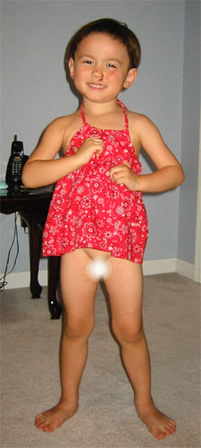 6/9/06 - 某天Luka問媽媽:「媽媽,為什麼我都沒有裙子穿?我也要穿裙子好不好?」媽媽當時建議Luka試穿媽媽的裙子好了,不過Luka說太大件不要。這天去逛很久沒去的BabiesRUs要買禮物送人,看到很多可愛的小女生衣服,於是選了一件要給小表妹。回家後媽媽問Luka:「Luka,這件裙裙比較小,你要不要試穿看看?」Luka很好奇地穿上,結果當然是太小!Luka爹在一邊直搖頭:「以後Luka就會喜歡穿女生衣服,然後上街勾引男生,那都是你的錯...」拜託!那個阿ㄍㄨ˙小學六年級還很興奮地試穿媽媽樂隊的迷你裙,現在也沒有愛穿女生衣服啊!而且,哪個小男生沒試穿過裙子啊?!想太多了啦...媽媽看照片才發現竟然連鳥鳥都露出來了,趕快打馬賽克!