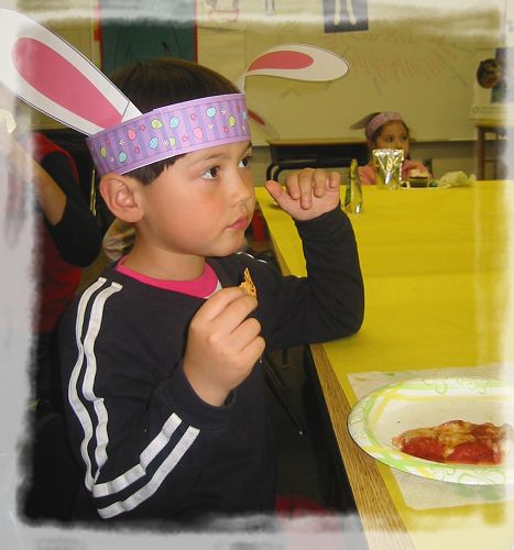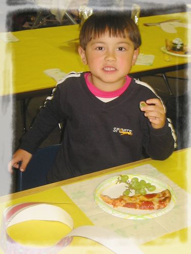 4/4/08 - 美國人是非常喜愛party的民族,寒假之前有party,春假前當然也要有party。四月五日開始為期九天的春假,所以前一天不愛party的媽媽還是硬著頭皮來參加Luka班上辦的party了,可惡也不愛party的爸爸藉口春假要去玩之前有很多工作要做,所以不克參加!Luka這次會想參加的理由很簡單,因為有pepperoni pizza,不過只吃了兩片就空了,只剩cheese pizza,少爺是不吃沒有pepperoni的pizza的。不過Luka竟然破天荒願意吃葡萄和西瓜,而且得到葡萄還蠻好吃的結論,要媽媽以後可以買葡萄來吃。奇怪,明明以前就吃過葡萄了,還每次都吃得心不甘情不願的!果然長大一歲願意接受的食物又多了一些,而且還是水果,不錯不錯,好現象!所以今年夏天我們的水果選擇又多了這兩種。〈以前幾乎都只有蘋果和柳丁,因為Luka只愛吃這兩樣〉