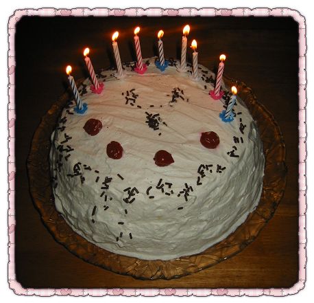 4/20/08 - 媽媽生日。我們家的西點蛋糕師傅應壽星要求,做了拿手的德國黑森林蛋糕,這次雪蓋滿整座黑森林,還是很好吃!