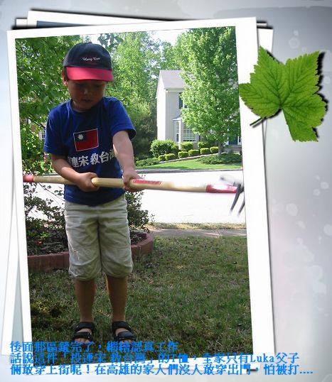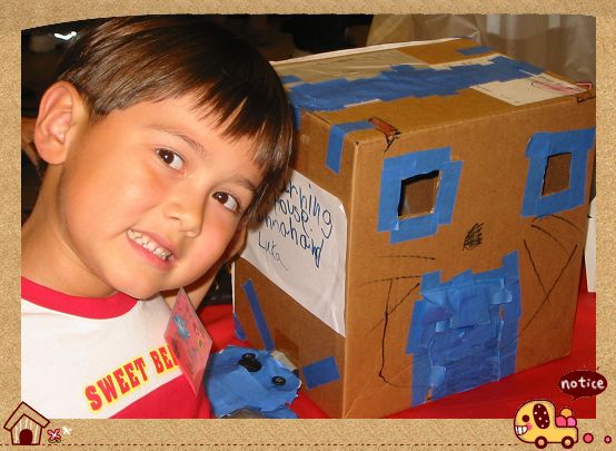 6/6/08 - 這星期Luka去參加暑期夏令營Camp Invention,從星期一到五,讓小朋友們利用各種可回收垃圾,發揮創意設計發明各種東西;還讓每個小朋友從家裡帶一樣不用的或者壞掉的小家電,讓他們可以拆開來好好研究裡面〈聽起來很像是Luka娘小時候愛做的事〉,順便還可以添加點東西,把小家電改造成別樣東西。Luka聽起來玩得很高興。最後一天要結束之前邀請家長去驗收成果,爹娘當然都去參觀了。下面第二、三張照片是讓貓嚇得不敢亂跑出房子外的東西,Luka當然解說了一堆他的想法,可惜媽媽聽不太懂這樣子可以怎麼嚇貓,所以當然也不記得原理是什麼了。最後一張照片裡的成品目前還在我們家,是可以飛到火星去的太空船。Luka說他明年還要再參加!