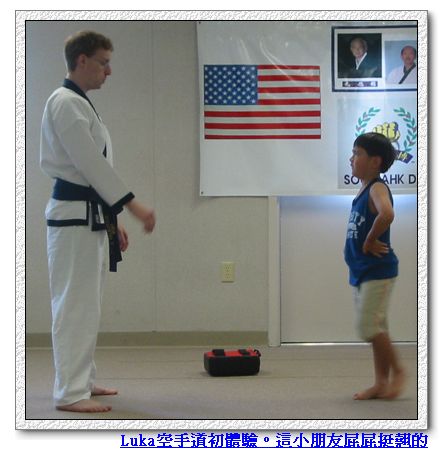 5/31/08 - 媽媽一直覺得學個自我防禦之類的功夫武術挺好的,反正Luka的個性並不會故意找人挑釁打架,似乎不用擔心學了之後這小朋友會到處找人單挑,而且媽媽的觀念是我不欺人,可是別人欺到頭上來也不能束手就擒,能像電視劇Bones裡面的Dr. Brennan那樣可以保護自己最好〈最近把CSI NY全四季拼完了,又不想看其他系列的CSI,於是轉戰Bones,蠻好看的〉。暑假開始後我們就讓Luka去試試空手道,看看這小子有沒有興趣,兩堂體驗課之後,Luka正式加入空手道的訓練行列。