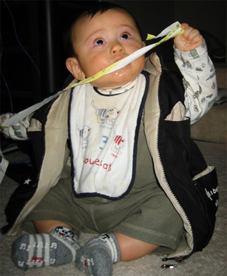 2/18/03 - 自台灣回來後,Luka漸漸從爬蟲類演進到靈長類,不但爬行迅速,花了兩天學會爬樓梯,還開始四處扶著東西站起來,已經可以扶著東西走路了。地板上的東西,每樣Luka都嚐過了,新的目標是放在桌上的東西!