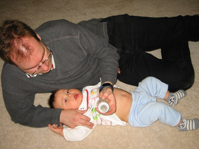2/26/03 - 爸爸剛從法國出差回家,Luka好興奮!不過只一下下就忘記了,繼續吃他的玩具.......