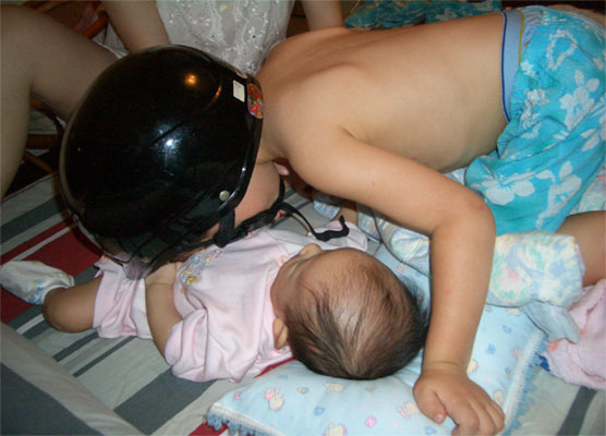 Luka喜歡戴著安全帽跑來跑去,說自己是工人ㄅㄟˇㄅㄟˊ!在室內也要戴,從阿媽家走到大姨家也要戴,很耍寶!